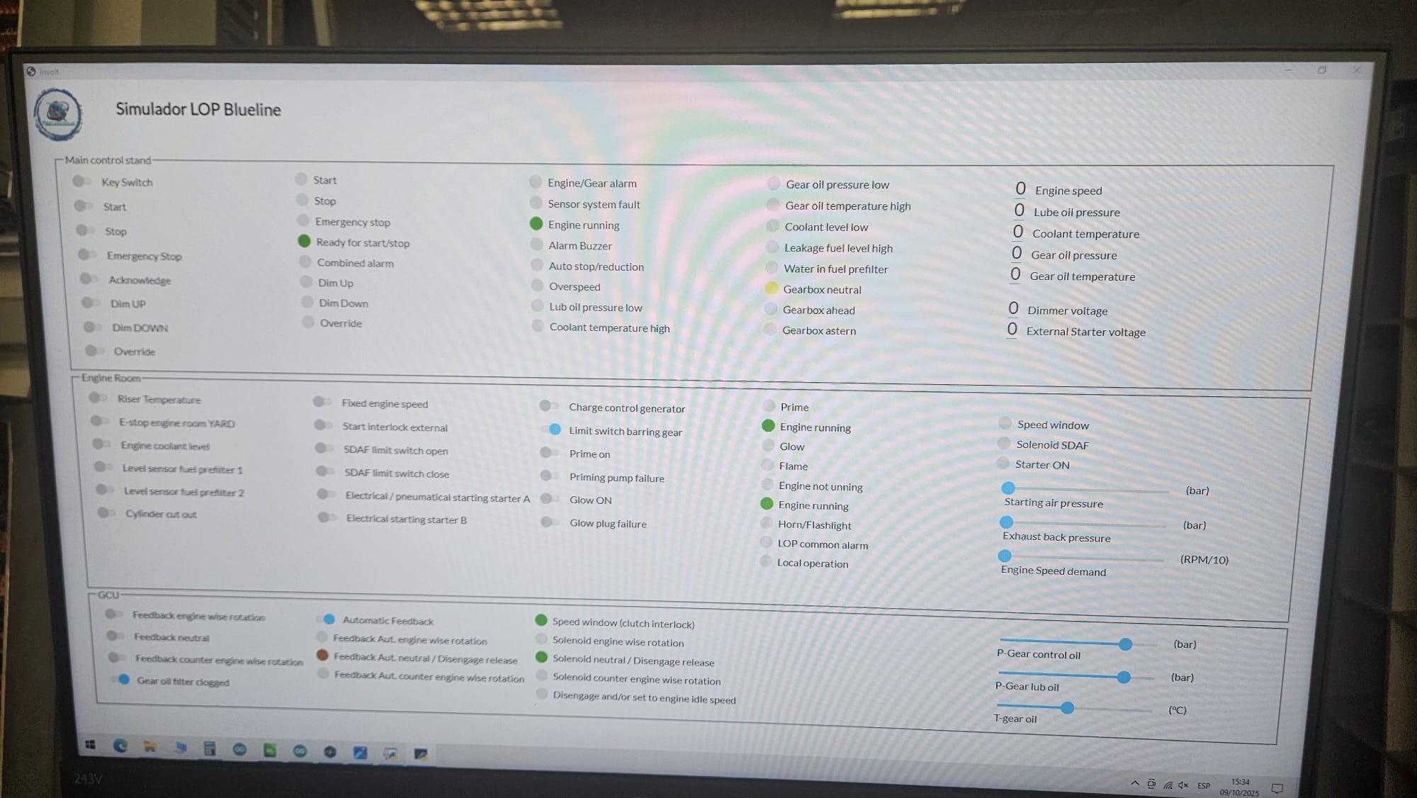 At the 3 first photos you can see the general vision of this simulator with Engine Room stage at down side using LOP, GCU and ECU, in the middle section you can see bridge modules with DIS10, PIM-MCS, PIM-RCS and ROS7, at the top you can see another fly station with DIS12, PIM-MCS, ROS7 and RIM box for ROS8 (remote unit for manouvering). Left side is prepared for an extension mixing the BlueLine with some extra units to convert it in a BlueVision system, using MFD1 displays, 2 stations of PPS, 2 stations of PIM5 and a final MCU with screen.