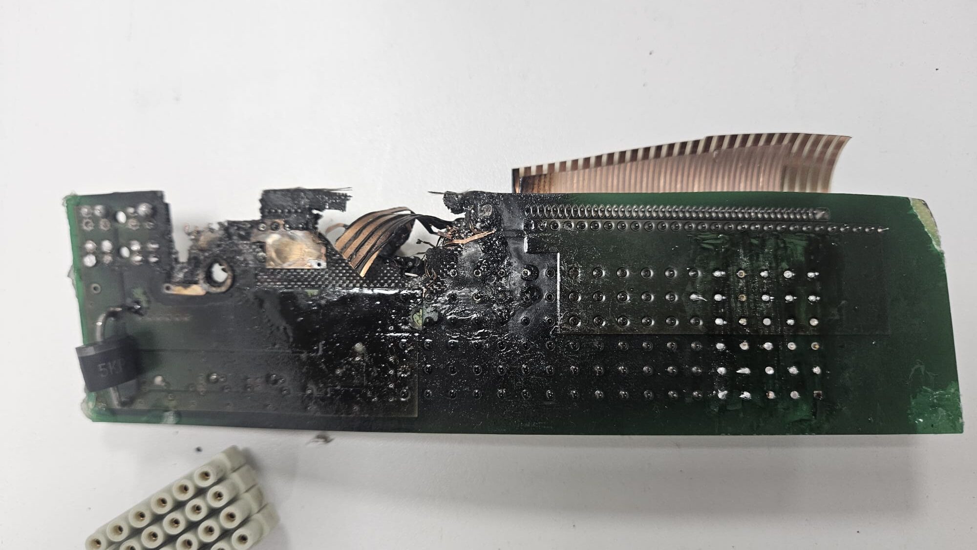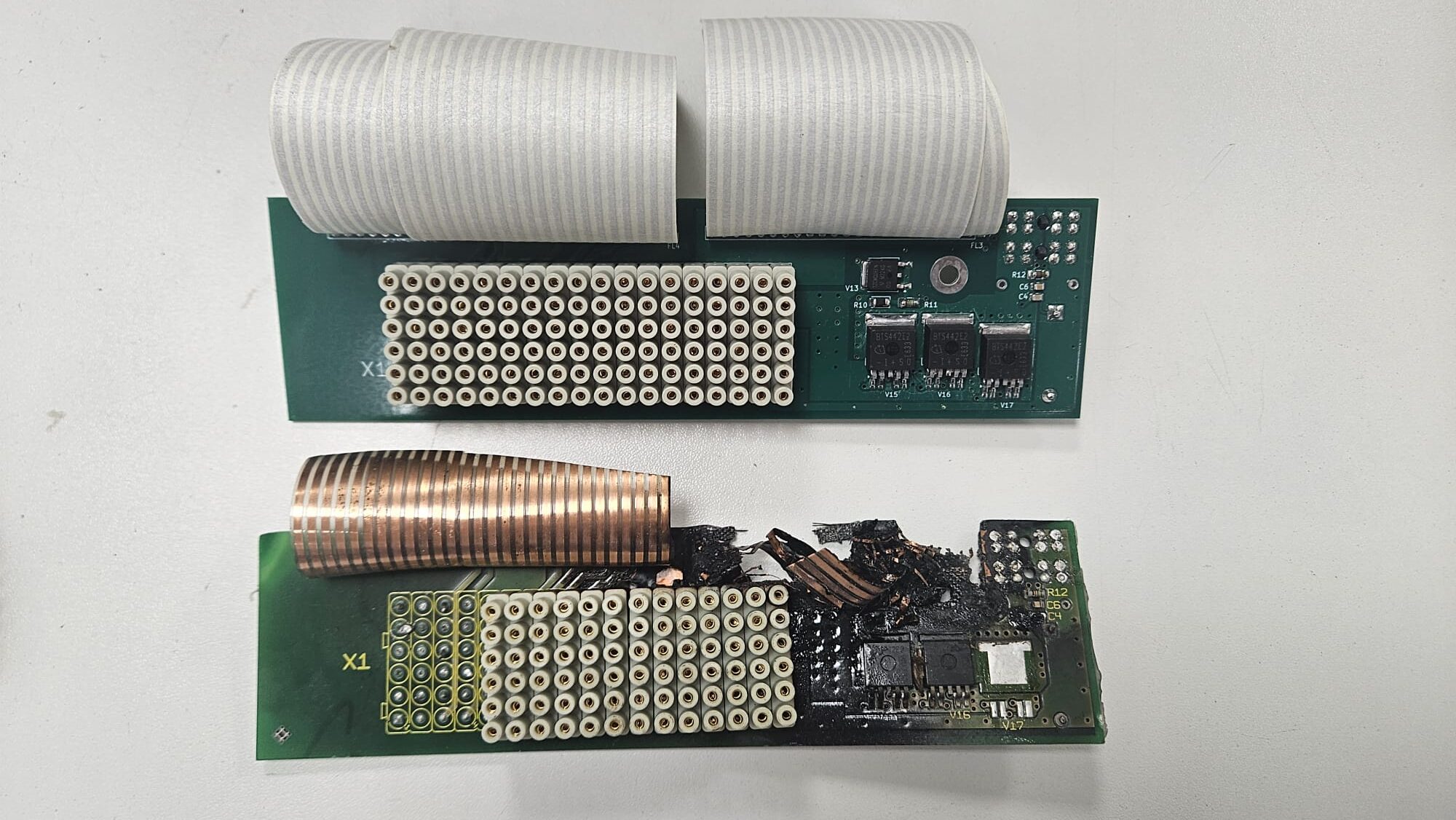 We received an LOP5 used in BlueLine ECS-183 with a big explosion inside. The blowup damaged one part of the electronic motherboard LMB1, in charge of managing high current for starter of the engine.