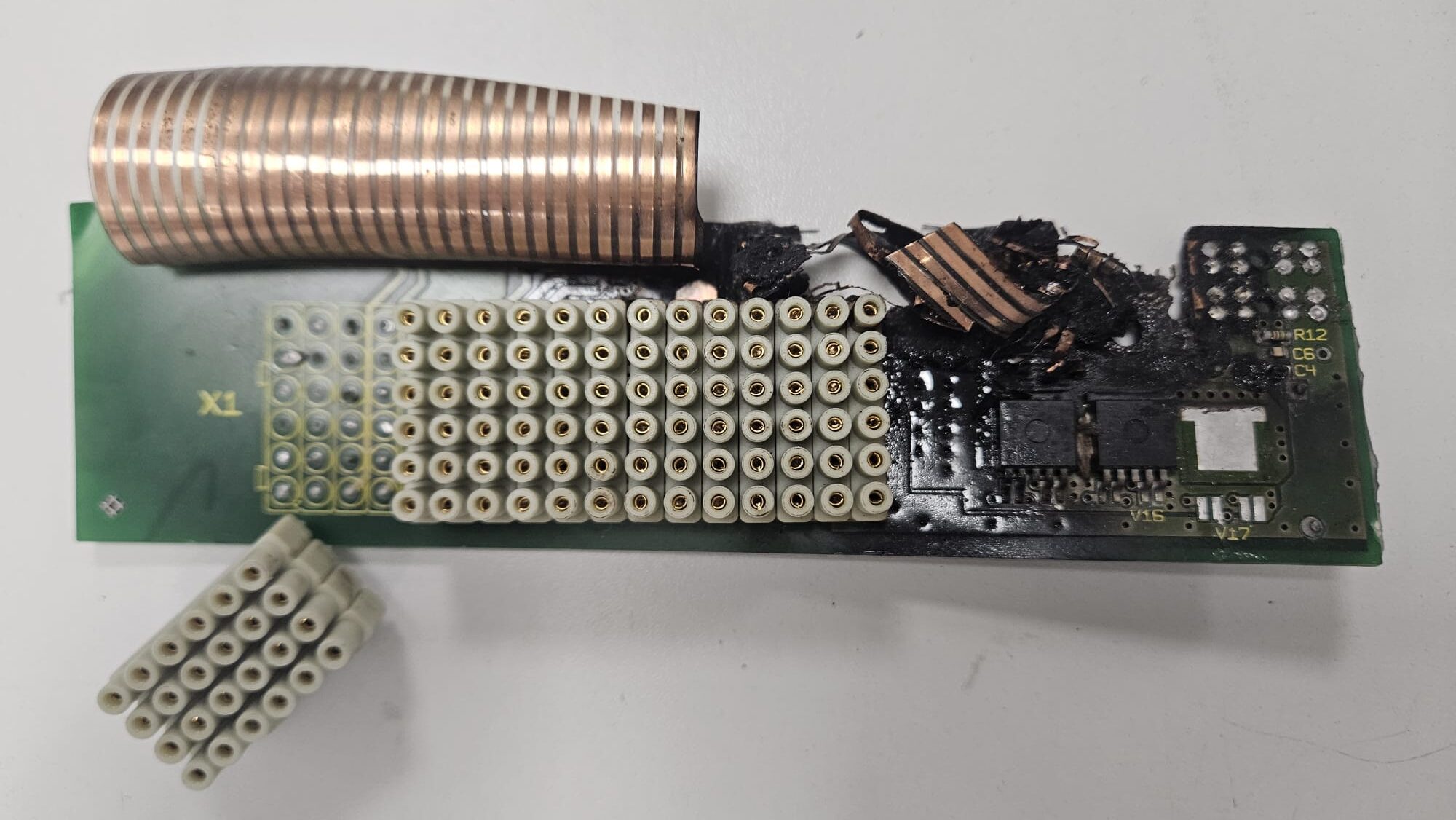 On the photos you see the result, giving a special solution to our customer, due to special damage on the board. At first you can see the high damage at PCB, then the board we designed and manufacture, taking in account the high current which have to manage this PCB. Last photos show the complete LOP showing the down internal side where this PCB is joined to the main motherboard.