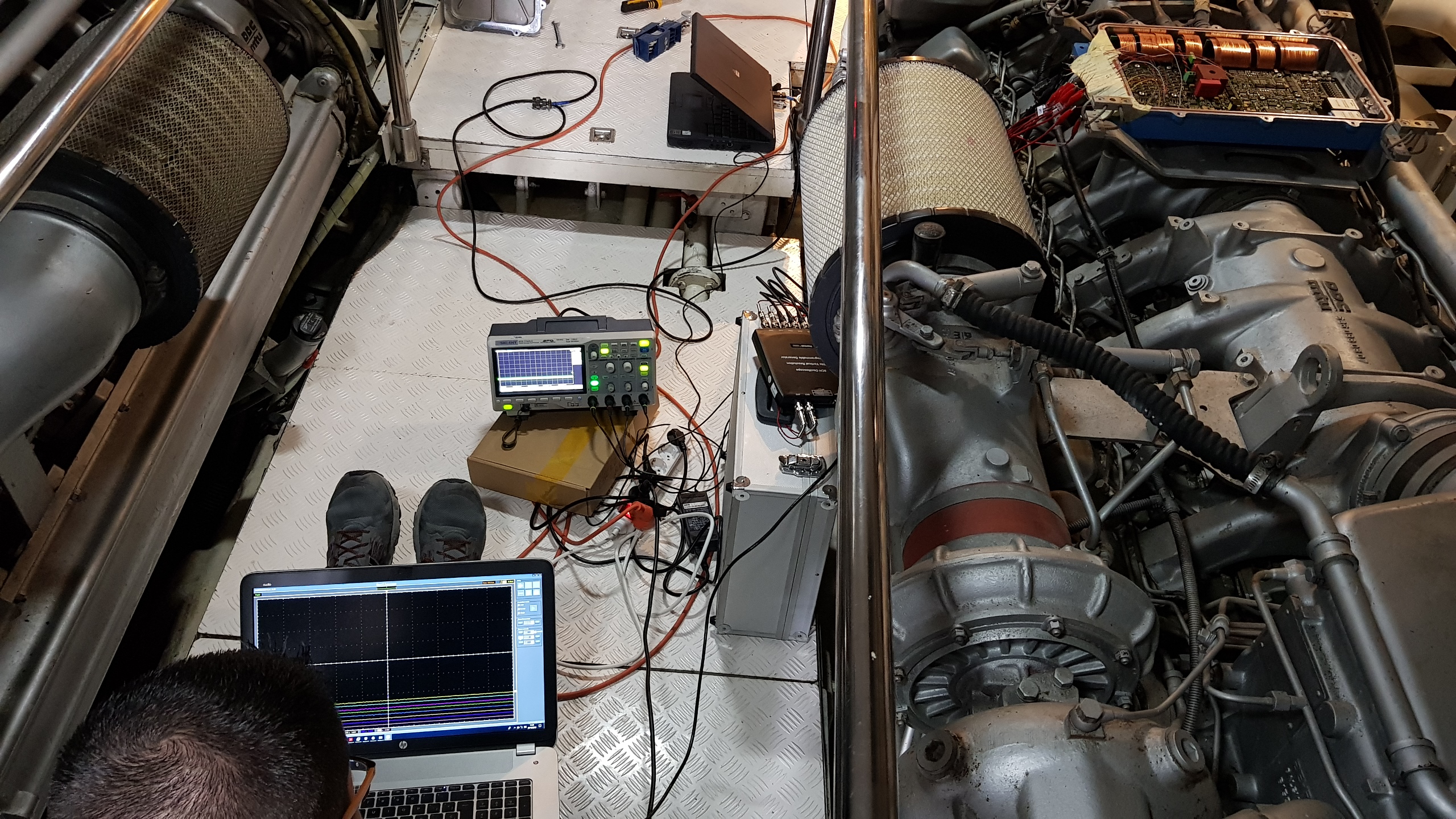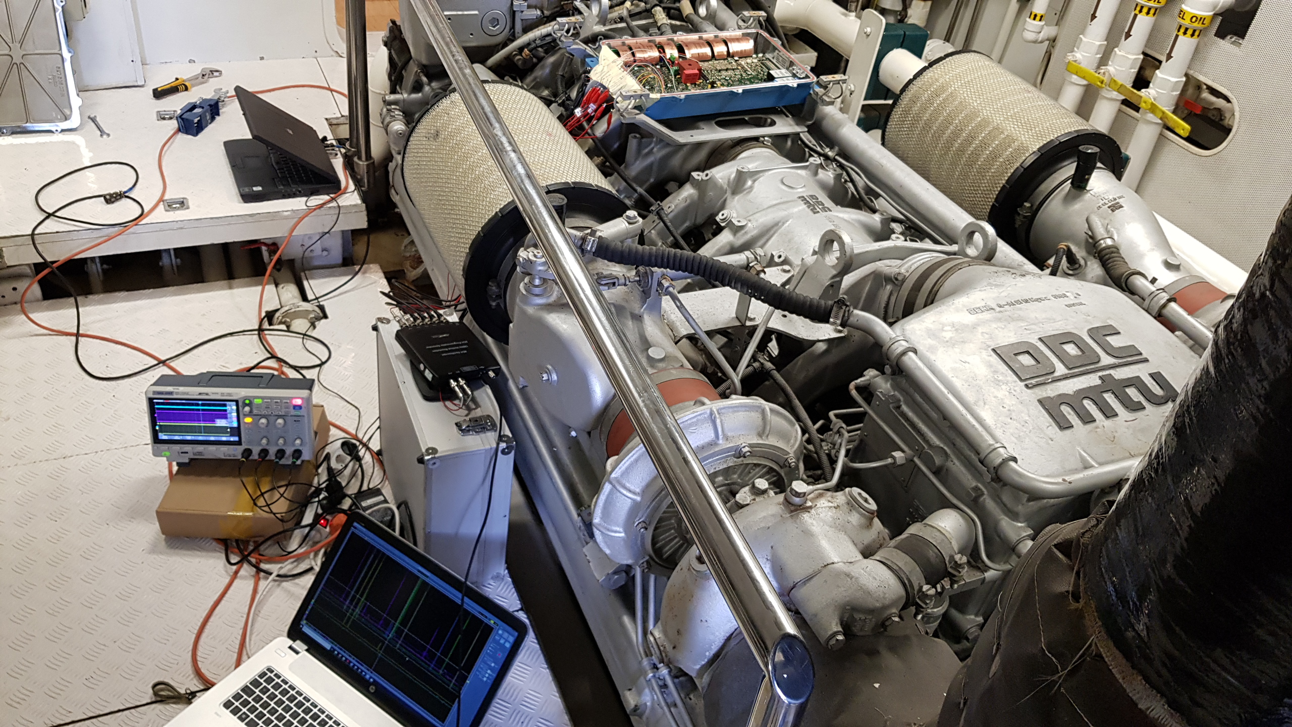 Estas fotos son de 2018, cuando decidimos crear un simulador para la ECU MDEC con el fin de poder realizar reparaciones más precisas. Fue un verdadero desafío, y fuimos a la embarcación de un cliente para tomar algunas mediciones estratégicas con el motor en funcionamiento.